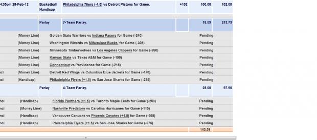 <TABLE class=ticket1><TBODY><TR><TD class=tck2>NCAA, Basketball</TD><TD></TD></TR><TR><TD></TD><TD class=tck2>Missouri 25-February-2012 1:00 PM PST</TD><TD></TD></TR><TR><TD></TD><TD class=tck2>Handicap +9.5 for Game -129</TD><TD></TD></TR><TR><TD></TD><TD class=tck4>Risking 25.80 to Win 20.00 CAD</TD></TR></TBODY></TABLE>1. Missouri +9.5 -129 @ Kansas