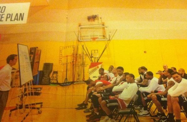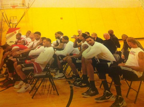 They've just completely tuned this guy out. Half of them are yawning, rolling their eyes, some of them are looking away, one guys drinking gatorade to try to stay awake, Battier's trying to act interested when hes clearly not, Lebrons clearly not interested either.