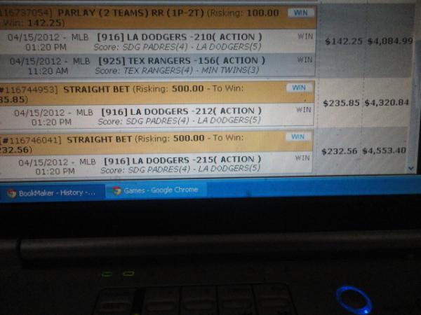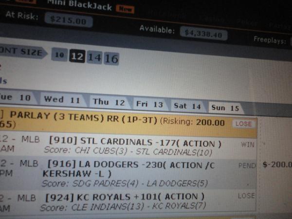 As I said $1400 on the dodgers.....$1000 dodgers ml (W)..........$100 on dodgers, rangers 2 team parlay (W)........$300 on dodgers, cardinals, royals 3 team parlay (L)..........totals $1400. The last $100 of the 3 team parlay was placed locally with my bookie. So my bookmaker.com account only accounts for $1300 of the $1400 I had on the dodgers. If you like I can get the phone recordings of my conversation with my bookie with regards to the last $100 you dipshitComment -