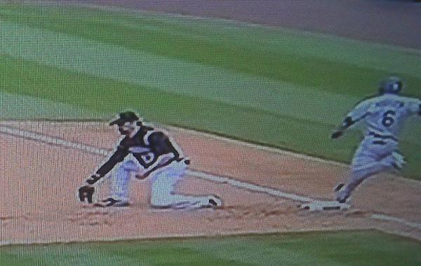 #81st baseman has sand on the lower part of his leg...You can easily see his foot next to the base.Comment -