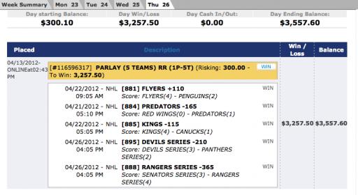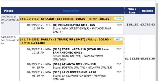 #26Nice hits, I made almost 10 grand doing parlays like that. Then lost 12. Start betting very very very very small. Those kinds of wins come once in a great while. Rangers didn't take that series easily. $ management #1 problem in capping, but good on ya for the wins