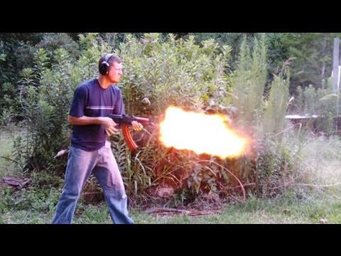 Sam, that guy's Krinkov is creating muzzle flash because he has removed the 'muzzle flash muzzle break' created especially for this weapon. Look at the other weapon videos, and if you watch the video of the kid on the extreme left upper corner (with the yellow cap on), he has the correct flash attached, and there is no noticeable flash. Also, these 'bump fires' are inherently dangerous. They ruin the barrel, and they create inherently unsafe chamber pressures, which can explode. If you are in the emergency room and see what they can do to a person's hands, arms, face, eyes, and scalp, you'd be wary to fire them in this manner. They do look cool, though. Safe hunting. For those of you unaware, these weapons are not automatic and cannot fire like machine guns. The user holds down the trigger and uses the recoil of the gun to push back on the next round and have the exposed firing pin SLAM into the next round creating the machine gun effect. A real automatic weapon in a millisecond closes the chamber on the next round, pauses for perhaps 1/16 of a second so the next round comes out close to where the last round was fired and also ensures that the chamber is completely closed and unable to explode, and then strikes the firing pin in a completely new motion. The video above sprays the bullets uncontrollably and can seriously harm a shooter. Sorry for the sermon, but please be careful and don't get hurt needlessly.