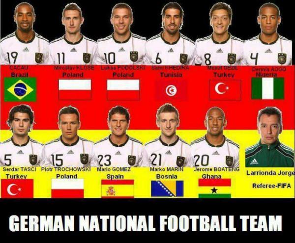 Nice job. Clearly you just hit share on every facebook picture you see... first of all, most of those guys don't even start on Germany. Second, some of those guys are BORN IN GERMANY. How more German do you want them to be? Khedira, BORN IN STUGGART. Boateng, BORN IN BERLIN, etc. You can't just look up last names and match them to the country that has names similar to them.