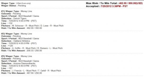 #10WagerType:PARLAY (3 TEAMS) Date: Team: Jul 25 MLB [966] ARIZON -192 [Action] Jul 25 MLB [975] DETROI -145 [Action] Jul 25 MLB [977] OAKLAN +105 [Action] Risking 46.71 SBR To Win 199.35 SBR