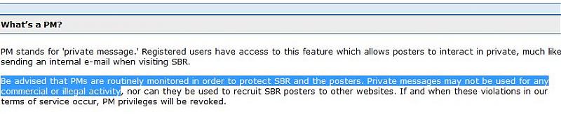 With regards to the Private Message (PM) feature here on SBR Forum, we would like to clarify our position moving forward so that all posters might better understand our policies.