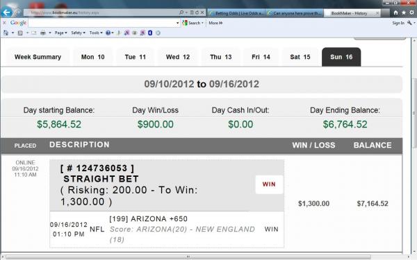 01:10 PMNFL [199] ARIZONA +650Score: ARIZONA(20) - NEW ENGLAND(18) WIN $1,300.00