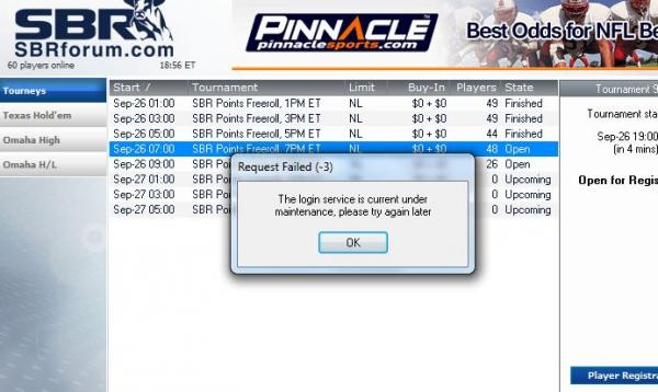 #175Signed up for 7 PM EDT tourney. Was not seated, tried to open the table and couldn't. Closed and re-opened the software and now the log-in service is currently under maintenance.Comment