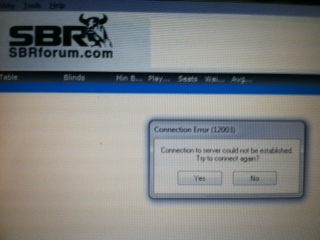Ah yes, the joy of SBR.... all day long have it up, no connection problems whatsoever..... so, my tourney starts, and the action is gripping.... As the play gets intense, I get ready to shove..... Here's a photo, capturing the intensity of what it's like to be in a big hand on S Bullshit R in their "world poker cup".... feel the intensity of living this grippin, grinding hand: