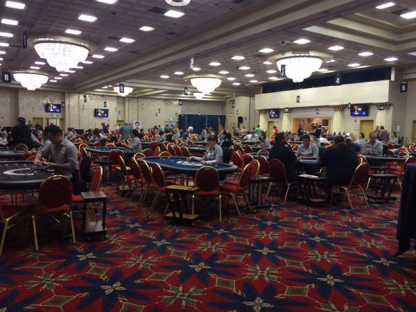 Walking upstairs to the 500 person freeroll now. 1000 starting stack 25 50 starting blinds and 10 minute levels so were gonna need a lot of luck.
