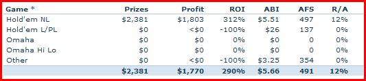 Game * Prizes Profit ROI ABI AFS R/A ITM ITM Hold'em NL $13,294 $9,097 217% $7.22 963 14% 94/581 16%Comment -