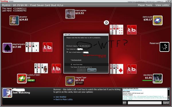 I guess this happens a lot. I asked a table i was trying to sit at and they said to log off and log back on. It worked. They said it happens all the time. A guy said he needed 14.4 million the other day. Bodog, fix your shit pal.