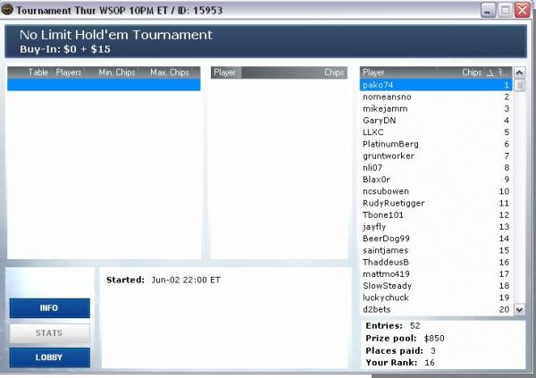 I managed to make final table. With the DC issues, I was folding until the bb hit me, leaving me with 138 left to call a raise, which I did. Lost to downsouth, who's looking good here.