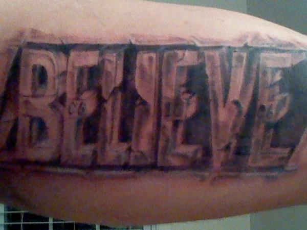 as for the Tat, of you look close there is 06-16-06 in the E's thats my wedding anniversary, and believe is just a word me and wifey like, believe in yourself, believe in the marriage, believe you can do it etcComment -