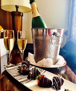 AD and his beautiful wife celebrating their 5th wedding anniversary with champagne, chocolate covered strawberries, and hot new orleans pralines just delivered five minutes ago via room service here at the Omni Royal Orleans in the French Quarter....