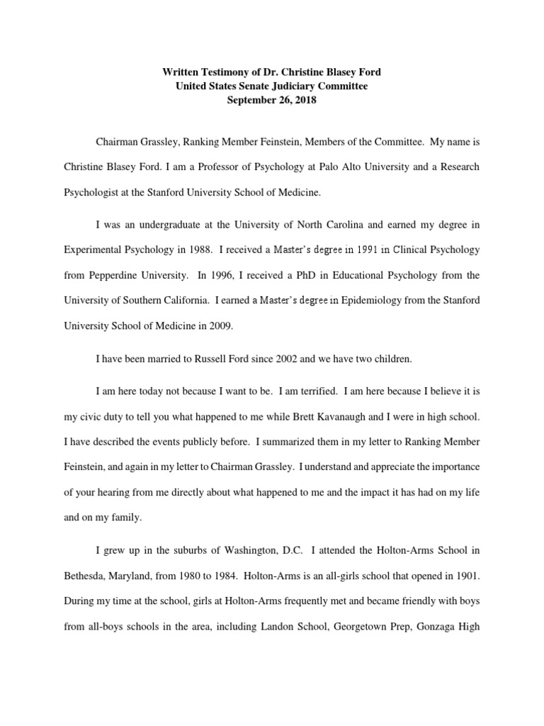 The Senate Judiciary Committee on Wednesday released the full text of Christine Blasey Ford's prepared testimony. Ford was the first woman to accuse Supreme Court nominee Brett Kavanaugh of sexual assault.