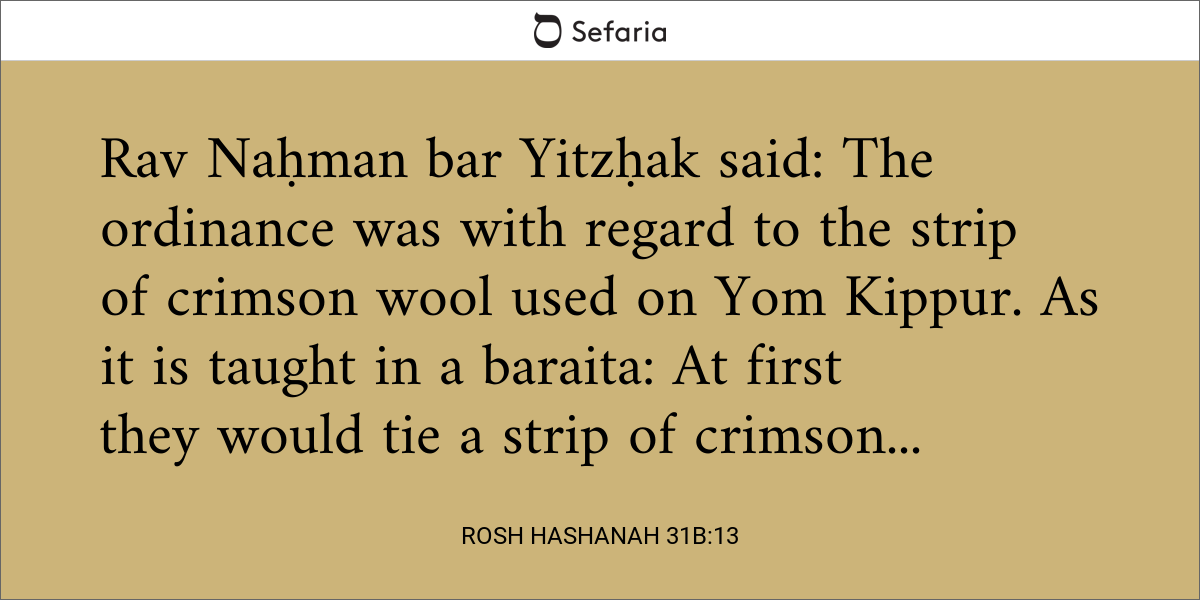 "Rav Naḥman bar Yitzḥak said: The ordinance was with regard to the strip of crimson wool used on Yom Kippur. As it is taught in a baraita: At first they would tie a strip of crimson wool to the opening of the Entrance Hall of the Temple on the outside. If, after the sacrificing of the offerings and the sending of the scapegoat, the strip turned white, the people would rejoice, as this indicated that their sins had been atoned for. If it did not turn white they would be sad. When the Sages saw that people were overly distressed on Yom Kippur, they instituted that they should tie the strip of crimson wool to the opening of the Entrance Hall on the inside, where only a few could enter to see it.