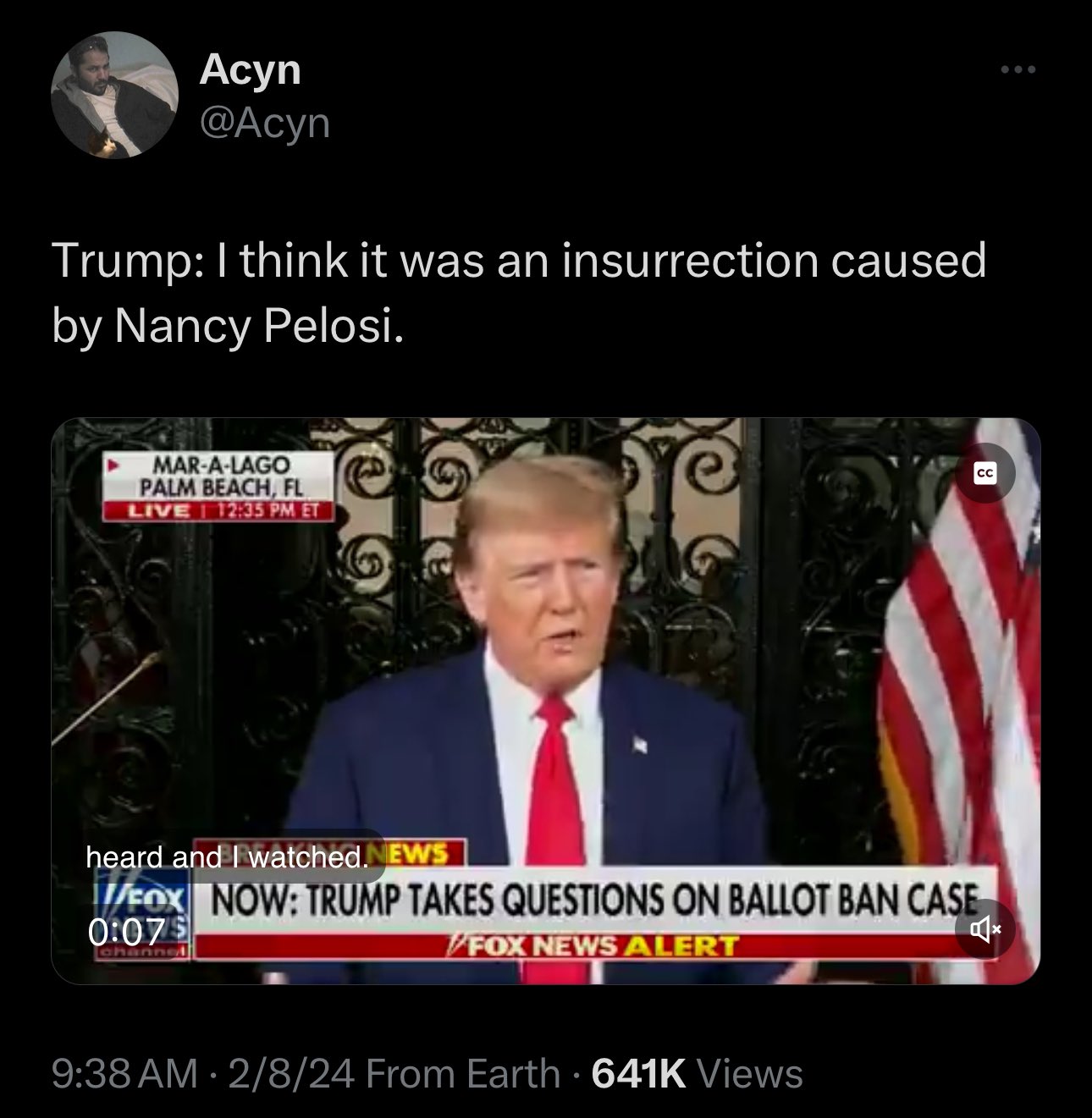 <blockquote class="twitter-tweet"><p lang="en" dir="ltr">I am honored to stand as an original cosponsor on <a href="https://twitter.com/RepMattGaetz?ref_src=twsrc%5Etfw">@RepMa ttGaetz</a>'s resolution that President Donald Trump did not engage in insurrection or rebellion against the United States. That is a fact. <br><br>Rogue Democrat operatives are attempting to use this lie to illegally take President… <a href="https://t.co/ypbvKvhKqg">pic.twitter.com/ypbvKvhKqg</a></p>— Rep. Elise Stefanik (@RepStefanik) <a href="https://twitter.com/RepStefanik/status/1754916546680418432?ref_src=twsrc%5Etfw" >February 6, 2024</a></blockquote><script async src="https://platform.twitter.com/widgets.js" charset="utf-8"></script>Comment -