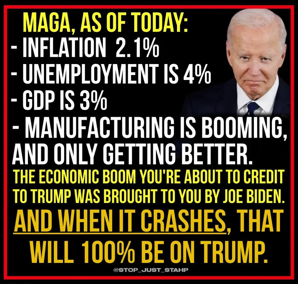 Biden stole the election and took over after the the world wide pandemic was on the tail end where businesses were forced to close shop. Before the pandemic America was experiencing its best economy in history, taxes were lower, record unemployment, and no new wars. Biden allowed 20 million+ people to illegally enter the country, allowed a war to start in the Ukraine, didn't enforce sanctions that were imposed on Iran which were basically broke under Trump and by doing so Iran were able to sell hundreds of billions of oil and use that money to fund Hamas and Hezbollah which started the war between Israel, Biden also had the disastrous Afghan withdrawal leaving behind almost 100 billion in military equipment, left behind Afghanistan allies who were so desperate that they grabbed onto airplanes and fell to their deaths, and was responsible for the death of 13 US soldiers. He hired a DEI Supreme court justice who couldn't even define what a woman is, hired a DEI cackling VP, and never fired any of his disastrous cabinet. Biden went directly against the SCOTUS and continued to bride voters with billions to pay off student loans. Biden spent billions on EV charging stations and built less than 6, he amended title 9 to allow men to compete against women in sports, he weaponized the justice system against his political opponent, he could barely put a sentence together or walk up stairs, and he called Americans "garbage". Biden accomplished almost nothing during his term except pander to the radical Left, divided the county. weakened America's image and empowered America's enemies. Biden was the worst president in US history.