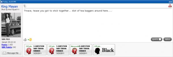 #50Originally posted by King MayanTtrace, tease you got to stick together... Alot of tea baggers around here.....
