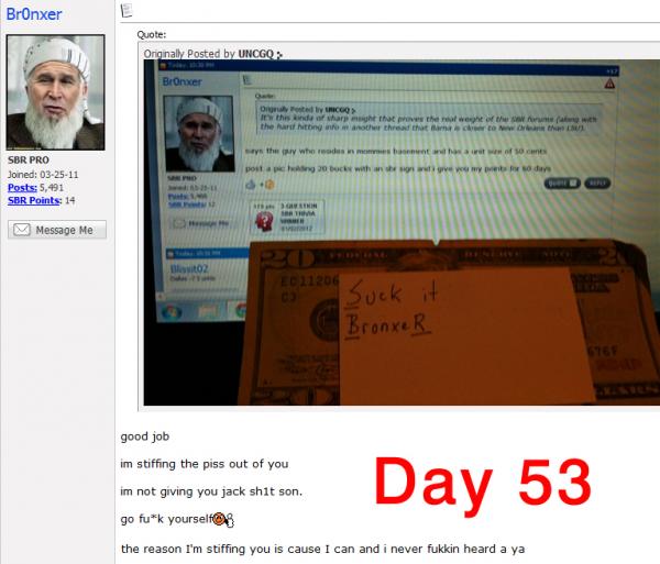 #26I knew he'd never pay, so I used it as another example of a Pro not being worth his word.Originally posted by zsrunreal, can't believe someone would take a pic with a 20 just because someone on the Internet called them a broke dikk.