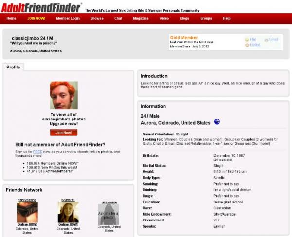 The guy made an account on Adult Friend Finder on July 5th with color red hair and his headline was, "Will you visit me in prison?"