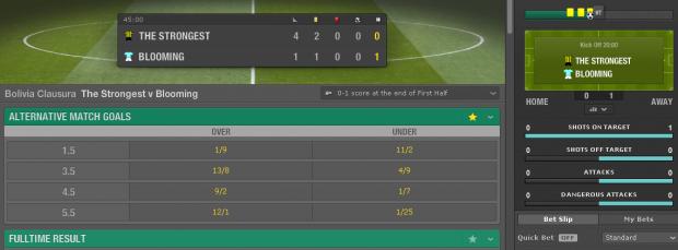 #1233how are they strange odds? The strongest were 1.30 to kick off, now losing 0-1 half time. so they are 2.20 to win? nothing wrong with that at all.Originally posted by AussiePunter123Something doesnt seam right with the strongest v blooming in bolivia.