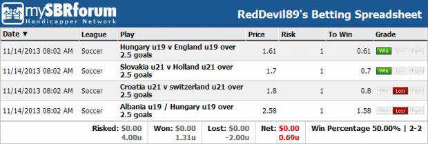 #52Cheers bro, first day always makes people nervous haha, remember everyone its a marathon not a sprint, we will make money!!Originally posted by fitguy67we interrupt this thread on "repetitive stress injury"...with a brief soccer announcement...RD has gone 2-1 on his inaugural slate of three straight-up plays...Netherlands going up 2-1 with plenty of time to spare
