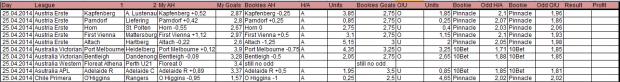 | Day | League | 1 | 2 | AH | Goals | Bookies AH | H/A | Bet U | Bookies Goals | O/U | Bet U | Result | Bookmaker | Odd AH | Bookmaker | Odd O/U |