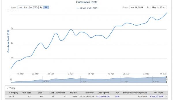 Pick@13 11-05-2014 15:00 Bologna (-0.5) v Catania (+0.5) 2@1.93 Pinnacle +186€