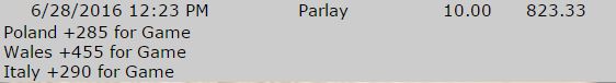 Poland to Qualify (+150 ) - I'm honestly surprised to see such high odds for this. Portugal has played 4 games so far and disappointed in all of them. The overall strategy of the team seems to be "pass to Ronaldo and maybe something will happen". They lack ambition and willpower, and remind me a lot of the way the England team plays. They are in the QF without a single win in the tournament so far. The Portuguese defense is quite vulnerable, and easy to break when tested. I feel like they have been given way too much credit for their progression vs Croatia, this was the first game in a major tournament since 1980 with ZERO shots on target in 90 minutes, Croatia simply played a horrible game and did not even test the Portuguese defense until extra time, where one of their first attacks ended with a shot against the post. I think this was a huge mistake on their part, as the Portuguese have conceded 3 goals against Hungary and could've easily been broken down if tested. Ronaldo has been sub-par, with his only goals coming against a very vulnerable Hungarian defence (as Belgium so clearly exposed), the rest of the team seems to lack focus and purpose on the field. On the other side, we have a Polish team which conceded one goal in their 4 games at the cup, and managed to get a draw against Germany, which they could've easily beat if Milik had not missed two of the best chances in the game. The Glik Pazdan CB duet has risen to one of the best CB pairs of the tournament. I feel like this will be a game where Portugal will be banging their head on the wall for 90 minutes, trying to score against Poland's solid defence, which will sit back for most of the game. This will expose Portugal in the back which Poland's fast wingers Grosicki and Blaszczykowski will make full use of. Lewandowski is still goalless at the tournament and this could be a game in which he will shine.