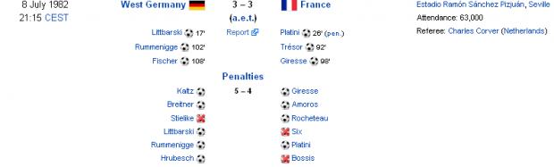 The best player for Germany Rummenigge was injured and didn't play (90min). With 20 min left in extra time and down 3:1(came in as a sub) scored a goal (down 3:2) .Later Fischer level the score 3:3.