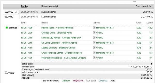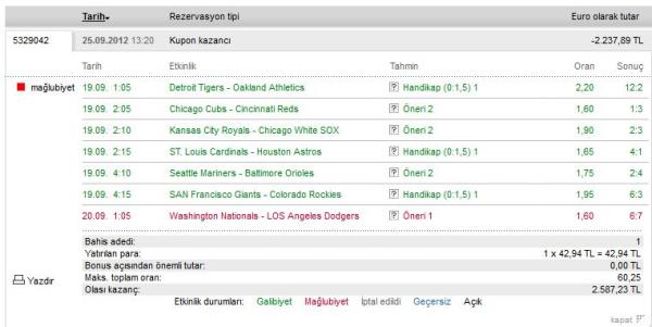 I made a coupon in Tipico 19.09 on Wednesday (at 00:20 Turkish time) including seven baseball matches. Those matches were all that days' matches as you see. First six matches won. Washington - L.A.Dodgers match was postponed due to rain. The stake of this match was 1.60 for Washington. Same day at 23.05 (04.05 American time) a match was played with the same pitchers as postponed one. Washington won the match 3-1 and i thought my coupon won also.(The stake of this match for Washington also 1.60) Tipico first paid my coupon but after three days they put the 20.09.2012 day's match into my coupon and Washington lost that match 6-7. But the pitchers and the stakes of this match were whooly different. The stake was 1.89.