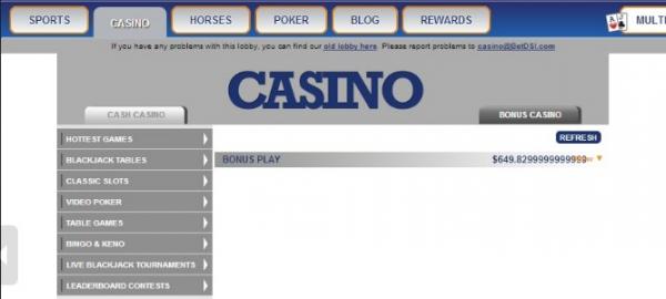 When you click on Bonus Casino it no longer shows you the games available for bonus play you have to click on a drop down menu now to access games available for bonus play, problem is the majority of text is hidden by rollover numbers, unless you put your mouse over it you don't know that it is the drop down for games you can play in the bonus casino.
