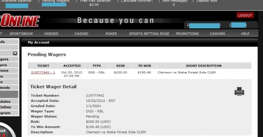 I placed several bets at BOL for Clemson on Thursday night game. All were paid out but one. The ticket they did not pay out on they completely removed from my account after the game. They did place the wager back into my account. However they failed to payout the winning amount.