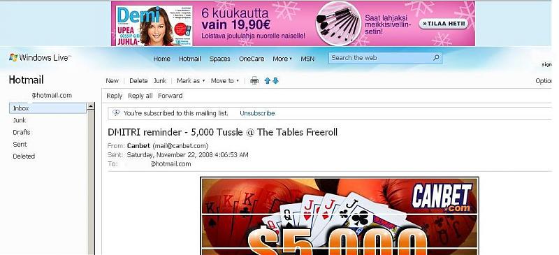 Canbet.com, a UK online betting company has failed to remove me from their mailing lists. I have tried to remove myself by sending them e-mail, which didn't work. Then I asked them personally in online help to remove me. Even though I was promised to be removed at least five times, the ads are still constantly coming to my e-mail. I have proof (chat transcript) of me requesting to be removed and I have proof with new e-mails, still, to this very day coming to my e-mail.