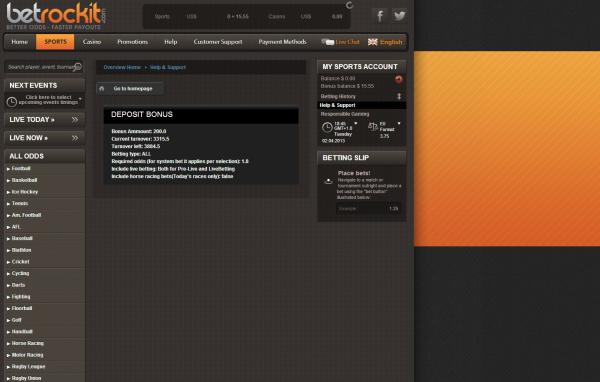 The sportsbook is Betrockit.com, which I have already red-flagged a few weeks ago, as they don’t allow professional bettors. I’ve studied them down before the red-flag and they were offering odds similar to Betredkings.com and a 200$ bonus for a 400$ deposit with 12 times rollover bonus + deposit before a payout could be asked. Seems fair, as this is a big rollover, but a good bonus percentage. At the time, the promotions couldn’t be seen on the webpage of betrockit as when a player clicked on “promotions” an error popped up. That was the second main reason for me to red-flagged it. Now, conditions for promotions on sports and casino can be seen on their webpage as they were able to correct the error on the page.