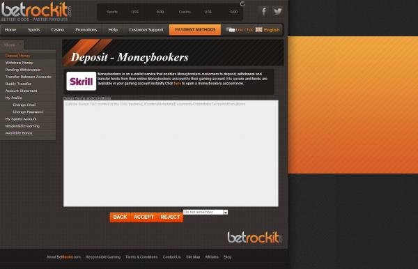 Tiago Miranda, my friend, opened and account with Betrockit on the 12th of March 2013. On the same day he deposited 400$ and got a 200$ bonus. On 12th March 2013, he says, nobody could see the bonus conditions and when a player should deposit his first money in the account, it would show the print I send you (pic 1). I tested this today by creating a fictitious account and going to cashier to deposit some money (which I obviously won’t going to do, I just wanted to know if this picture would show up). And before I could get the chance of depositing, the very same image was showing on the screen. Seeing this, I was stunned with the lack of information on Betrockit. There is no information about the bonus conditions on the acceptation process whatsoever. Furthermore, there is no explicit question such as “Do you accept the bonus conditions for the first deposit bonus?”. In ALL books I’ve got bonuses, I always had this question in front of me or had to get a code for the bonus. So, a player is, in fact, accepting something he just don’t know what it is. I have to underline the fact that a few weeks ago, the bonus conditions couldn’t be seen anywhere as it showed an error when a player tried to see it. This I know for a fact as I saw it with my own eyes. I can not know if this was still happening on the 12th March, but the probability of it is very high as Tiago said the very same thing as I experienced.