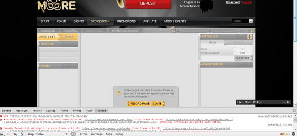 I took a "double the double" bonus at mooregames. It meant that they double the winning odds if both German teams will win their first semifinal matches in UCL. I bet 55€ for odds 5,1 and won thus 562€. T&C claimed that I have to wager 2 times my winnings and wager. However I placed several bets and wagered 1122€. Then I asked support if I have met wagering requirements. (I was unsure if I have wager just 1122€ or 1232€). However the support said that I have to wager 110€ more. Since then I was unable to place any bets due to "technical error" that occured every time I tried to open sportsbook. It is weird because when I was not logged in I was able to load their sportsbook page but when I logged in, the error occured every time. In addition the error occured at every computer and browser I tried to open their sportsbook. I tried to place bets from four different computer and a couple of browsers but the error occured every time when I was logged in. When logged out, sportsbook worked normally every time. Because of that I contacted Mooregames`technical support that said that the problem is with me and that their servers are working normally. The only assistance they said was that I have to wait until the problm has diappeared itself. Due to that I was unable to wager that 110€ that was needed to fulfill my wagering requirementand after a couple of days they have took 893€ (bonus and winnings) from my account according to their bonus rules.