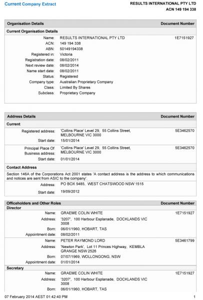 Any way, in light of Tommy's last post, I thought it would be useful to post a copy of the Company Extract for Results International Pty Ltd. I've provided a screenshot of the main page, plus you can download the attached PDF to view the full document.