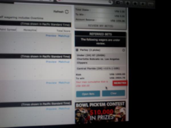 #2Sorry Makinplayz, that's a tough break. If the bet was successfully placed they should pay you. If you have proof too, then there is really no reason for the cancelation.Originally posted by MakinPlayzI placed a parlay wager last night both on the second half a NCAAF and NBA game. I took UCF +11.5 and the Under 97 on the Clippers and Charlette second half. The bet went through, and next thing I see 40 minutes later that the bet was under review because of my Max cumulative risk was over $500. So does this mean I cant place a parlay wager over 500.00? Also why reject the wager after its a winner after the games are over. I wonder if I would have lost the bet it would have still been rejected. Someone please help explain if this is common practice. By the way I placed the parlay for 1000.00. I will upload a screen shot as well.Comment -