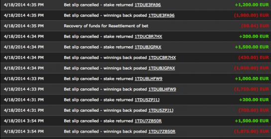 Hey guys. I put 400euros in my Bwin account for live tennis betting and I won to 8100euros in 4days but yesterday I lost 400euros so totally I got 4100euros in my account before I went out for dinner yesterday. After i was back home. I found that 3000euros were taken out of my account by bwin. At first I have no idea about what happened, I thought it was the system error. But afterwards I found out in the history that they cancelled some of my winning bettings that were set one or two days before.