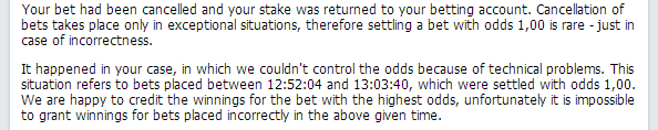"Your bet had been cancelled and your stake was returned to your betting account. Cancellation of bets takes place only in exceptional situations, therefore settling a bet with odds 1,00 is rare - just in case of incorrectness.It happened in your case, in which we couldn't control the odds because of technical problems. This situation refers to bets placed between 12:52:04 and 13:03:40, which were settled with odds 1,00. We are happy to credit the winnings for the bet with the highest odds, unfortunately it is impossible to grant winnings for bets placed incorrectly in the above given time."