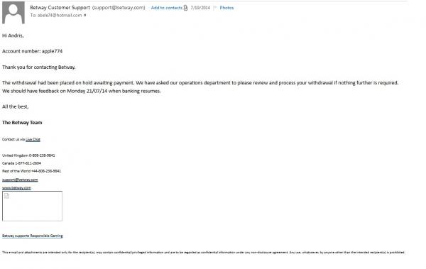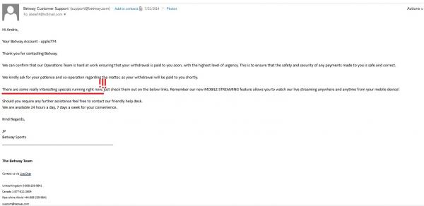 21st July 2014 – I have received same old “our Operations Team is hard at work ensuring that your withdrawal is paid” spiced up with some “care” from support - “great offer” from Betway – offering me to bet on some specials instead of withdrawing my money. NO COMMENTS ON THAT ONE! (see pic2)