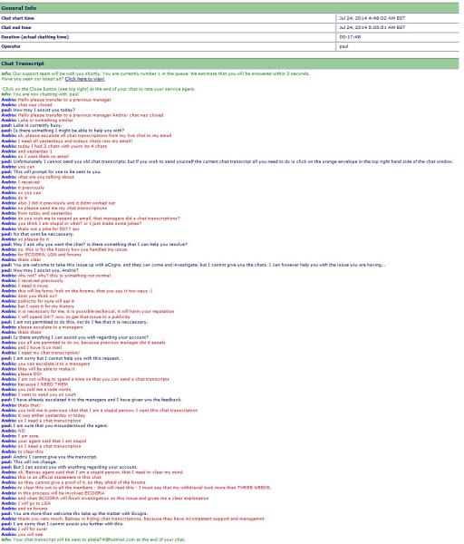 paul: You are welcome to take this issue up with eCogra, and they can come and investigate, but I cannot give you the chats. I can however help you with the issue you are having...