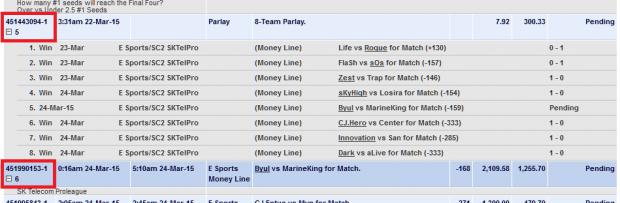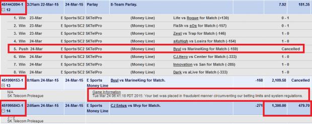 To begin with, I have been using Pinnacle for about 1.5 months now and have had no issues in the past. The issue begins with an e-sport 8-leg parlay bet made on 22-Mar-2015 and another bet made on 24-Mar-2015. The specific event in question is Byul vs MarineKing in the SK Telecom Proleague event.
