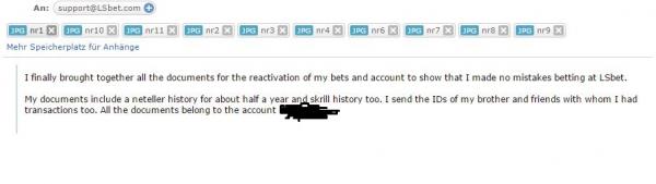 I have big problem with LSbet.com. I have my account there now for over a year( might be much longer but I am not sure). Over a long period of time I have made always deposits from 300-2000 Euro. I havent always being a winner. I lost huge amounts there too. In the last 2 weeks I have won with livebetting over 20.000 euro. Last week I made like four withdrawls of 1100-1400. Its not possible to withdrawl there through skrill or neteller more. After I made these withdrawls I had like 16000 Euro left. None of my withdrawls were approved by LSbet. Then I got an e-mail where was said I should send a photo of me where I am holding my passport in my hand and photo with of me with a papersheet in my hand on which is written my name, my username and I should sign it.