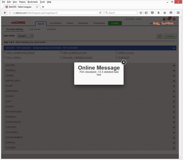 Now the market has moved to -15.5 they have decided to cancel my bet at approx 5:30pmET. I just called BetCRIS and was informed that they have the right to cancel any wager at any time if they believe if it is a bad line. So basically if the market would have moved to -13 the bet would stand.