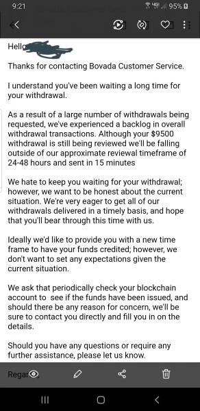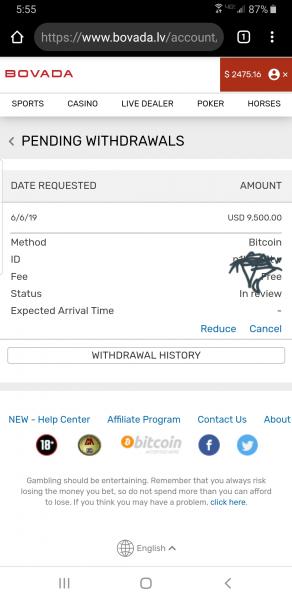 I've been a member of Bovada for just over a year now. I lost about 3k a few months ago and decided take some time away. I invested $1200 2 weeks ago, and got my bankroll up to $12k. I submitted for the payment to be a wire, for $9500 . They emailed me and told me that my bank would not accept their wire. So, I decided to use what's easiest and fastest for them and did a btc withdrawal.....