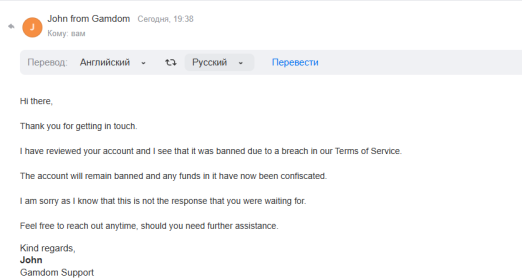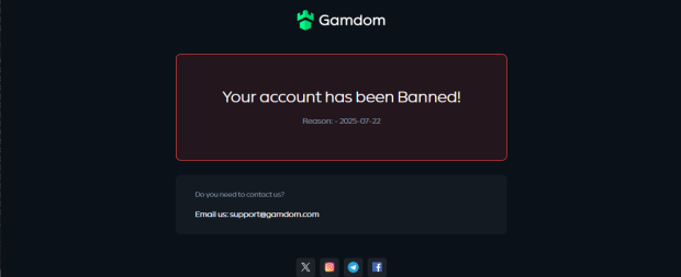 22.07.2025 Gamdom.com blocked account without reason and scammed 245$. I was on the site when suddenly I saw the message: Your account has been Banned! Reason: - 2025-07-22