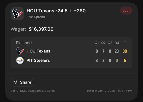 In the MNF playoff game tonight towards the end of the game when Houston scored a TD to go up 30-6, DK had a live in game of Houston -24.5 with a little over 2 minutes left. The PAT was still pending, and I placed a 15k wager on it (I commonly make wagers like this and I had a good weekend), so as I place the wager I notice that the wager isn’t being accepted yet and it was just frozen on the screen waiting for the DraftKings team to manually approve the wager. Well, as this is going on, the PAT is attempted and it was missed. So with the score now 30-6 Houston -24.5 went from a 75 percent chance of winning when I tried to make the wager to 1 percent of winning as they were never going to score again unless a defensive TD. DraftKings essentially freerolled me, had the PAT been made they never would have accepted the wager. They waited until the decision was made and the PAT missed to accept the wager! My equity went from 15k to $150 immediately by them doing this to me. It is total fraud!